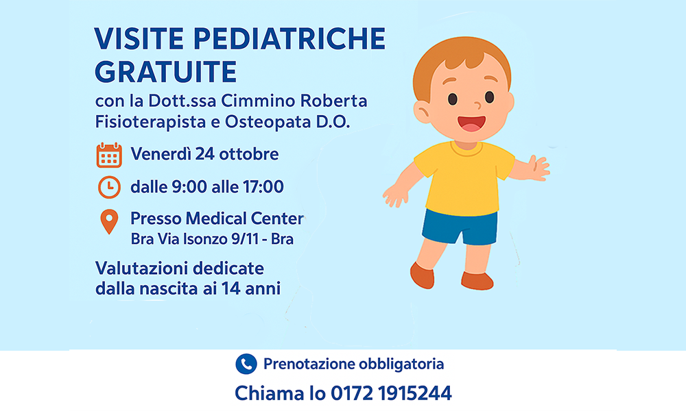 Visite pediatriche gratuite con la Dott.ssa Cimmino Roberta, Fisioterapista e Osteopata D.O. Venerdì 24 ottobre dalle ore 9.00 alle ore 17:00 presso Medical Center Via Isonzo 9/11 - Bra